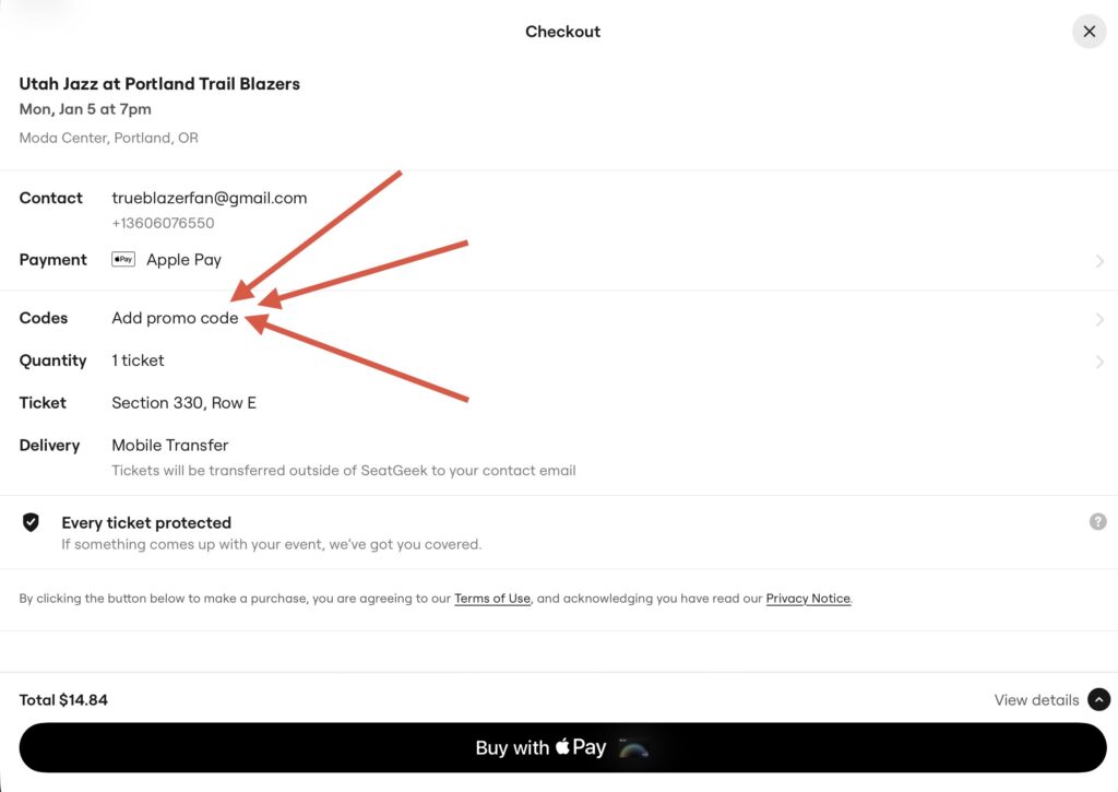 After you do that, enter the promo code trueblazerfan and it’ll be saved to your account. Then, the next time you decide to buy tickets using SeatGeek (which should be the next time you buy event tickets), simply click on “Add promo code” when you’re checking out, and click on one of your saved codes! Or, if your don’t have any saved codes, simply click “Add code” and add my promo code.